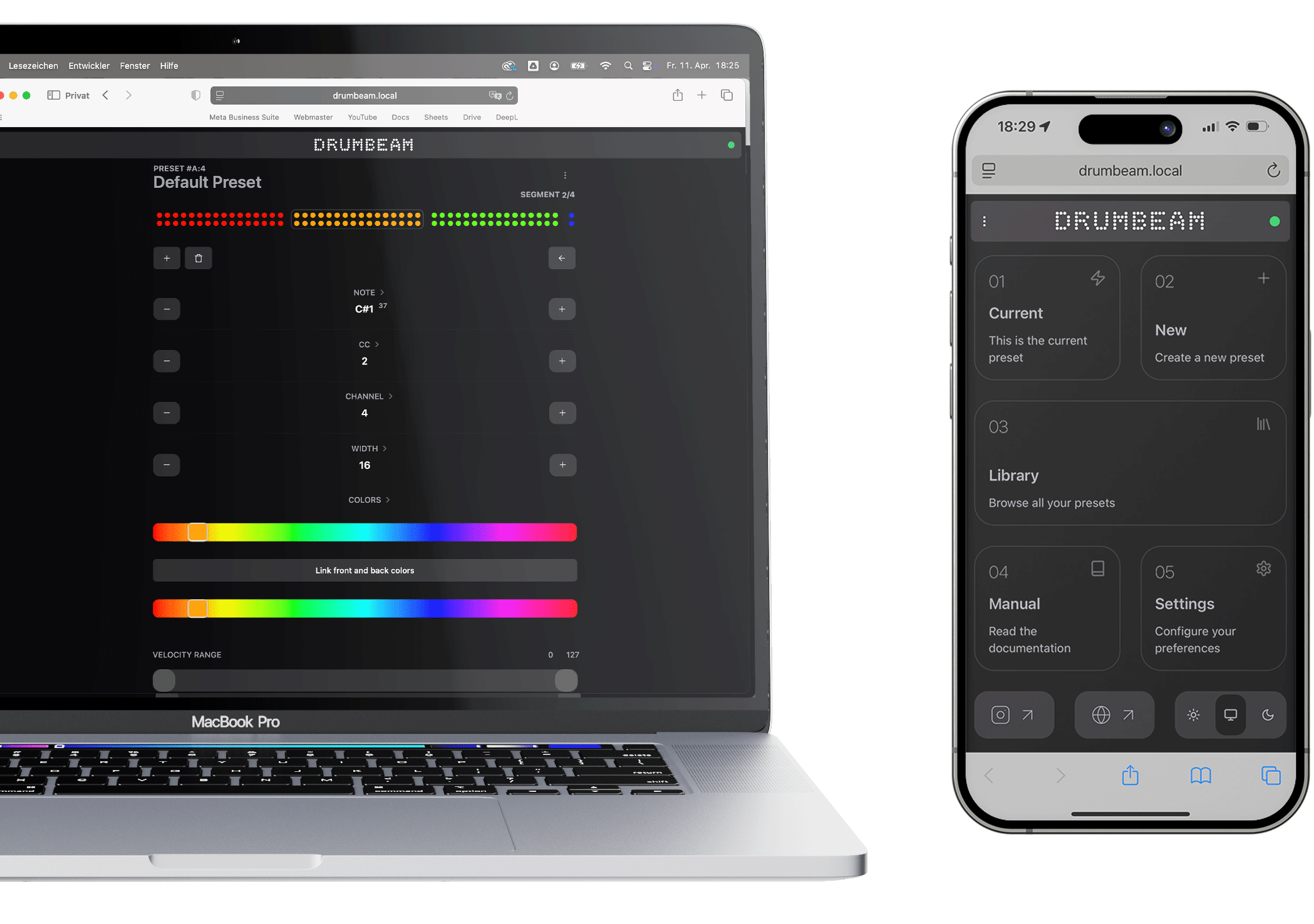no installation or app store. just pair your device with drumbeams wifi network, open drumbeam.local in your web browser and tweak around, while watching your changes in real-time